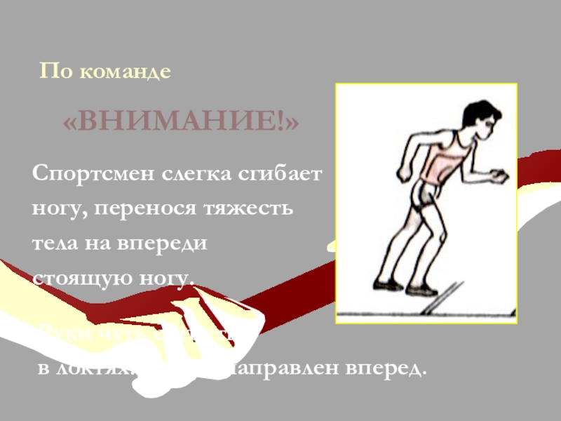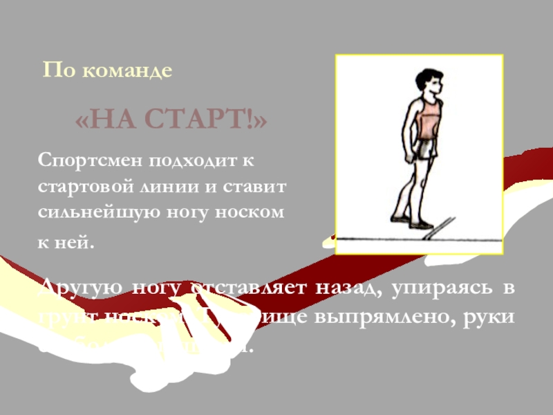 Другую ногу отставляет назад, упираясь в грунт носком. Туловище выпрямлено, руки свободно опущены.