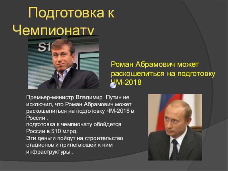 Премьер-министр Владимир Путин не исключил, что Роман Абрамович может раскошелиться на подготовку ЧМ-2018 в России .