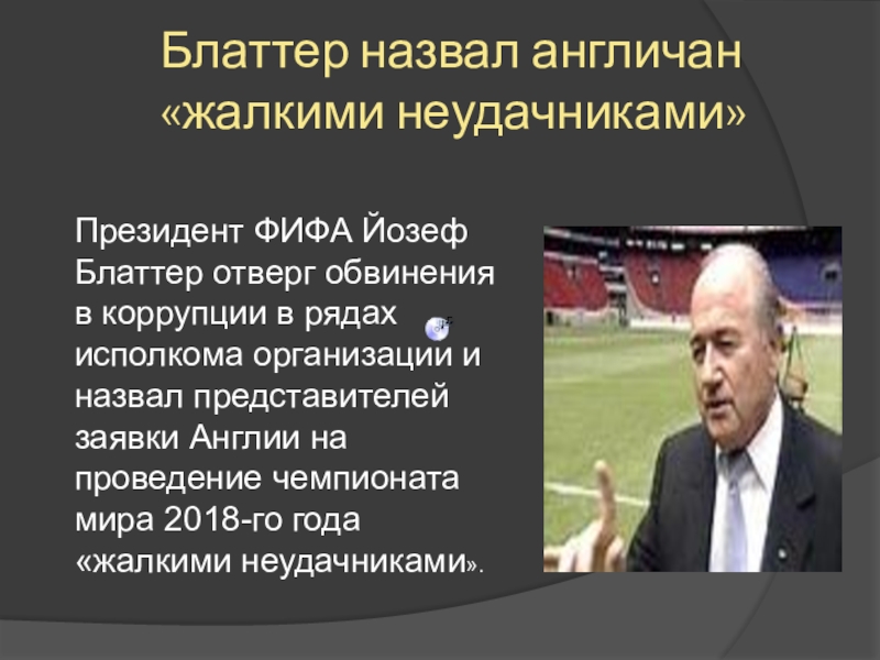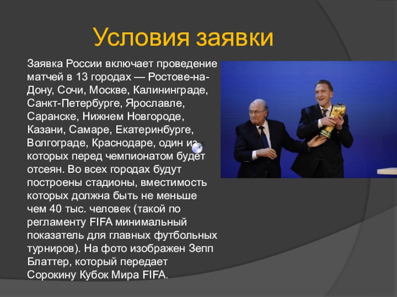 На почетное звание главного организатора Чемпионата мира футболу в 2018 году, помимо России, претендовали Великобритания, Испания, Португалия, Бельгия и Нидерланды. В свою очередь, принять у себя Чемпионат в 2022 году надеялись, помимо Катара, Япония, Южная Корея, Австралия и США.