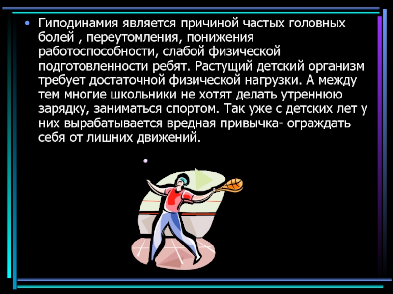 Гиподинамия является причиной частых головных болей , переутомления, понижения работоспособности, слабой физической подготовленности ребят. Растущий детский организм
