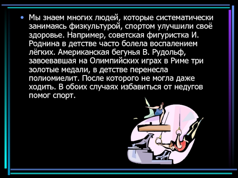 здоровье. Например, советская фигуристка И. Роднина в детстве часто болела воспалением лёгких. Американская бегунья В. Рудольф, завоевавшая на Олимпийских играх в Риме три золотые медали, в детстве перенесла полиомиелит. После которого не могла даже ходить. В обоих случаях избавиться от недугов помог спорт.