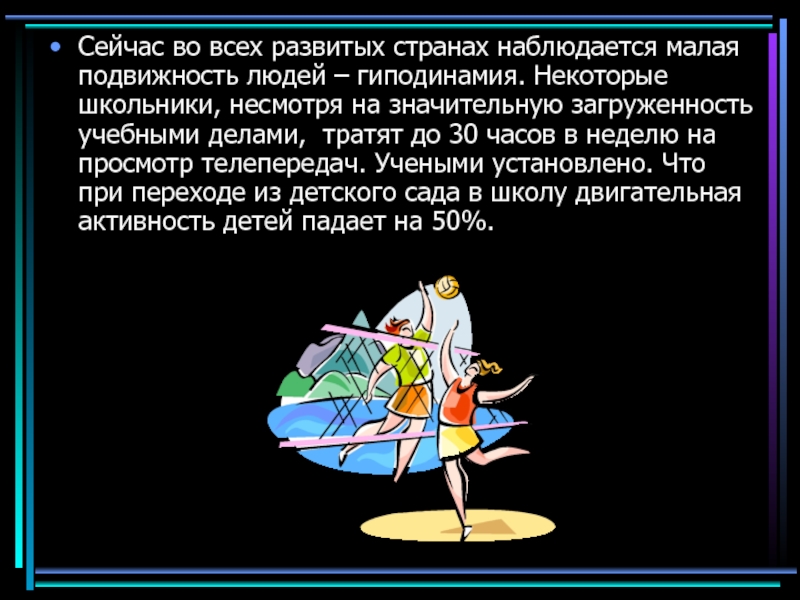 Сейчас во всех развитых странах наблюдается малая подвижность людей – гиподинамия. Некоторые школьники, несмотря на значительную загруженность учебными делами, тратят до 30 часов в неделю на просмотр телепередач. Учеными установлено. Что при переходе из детского сада