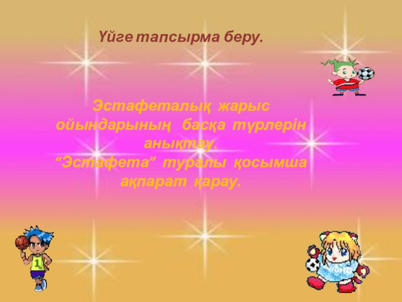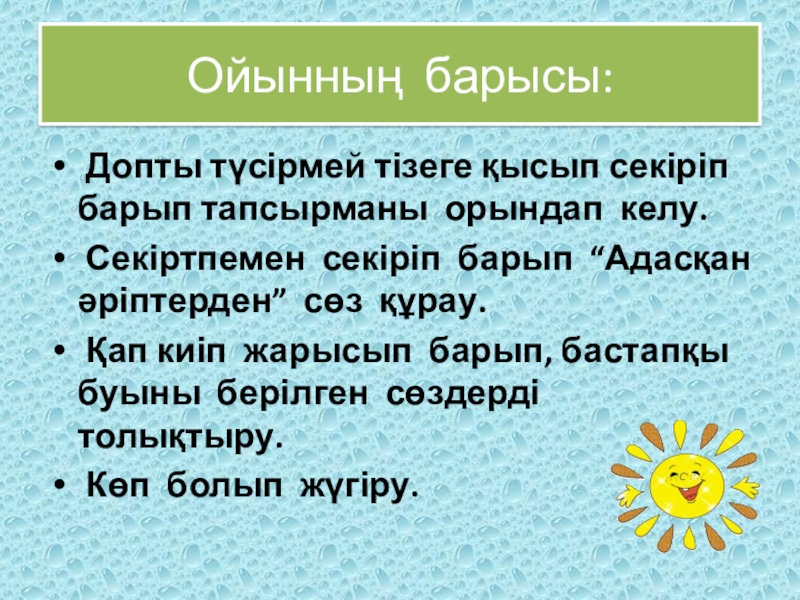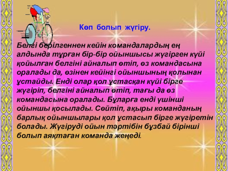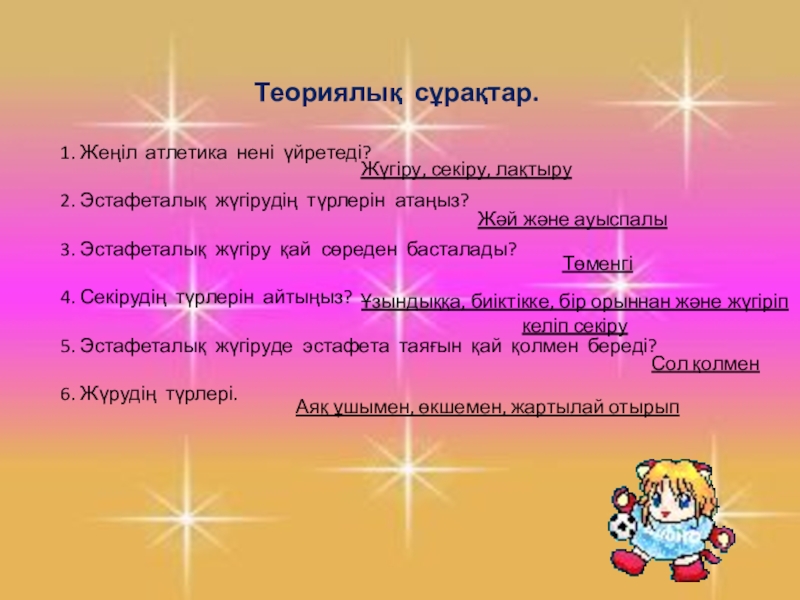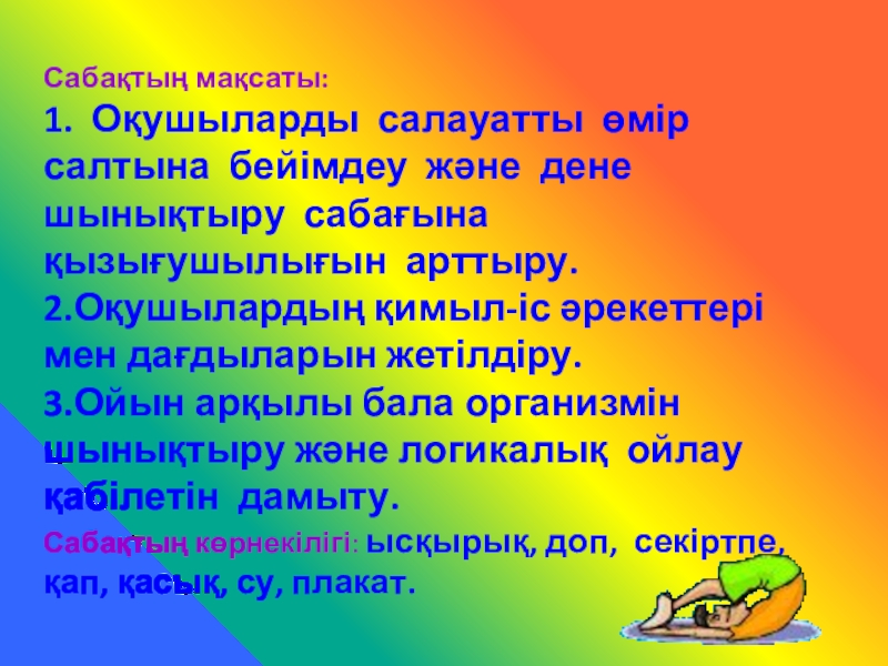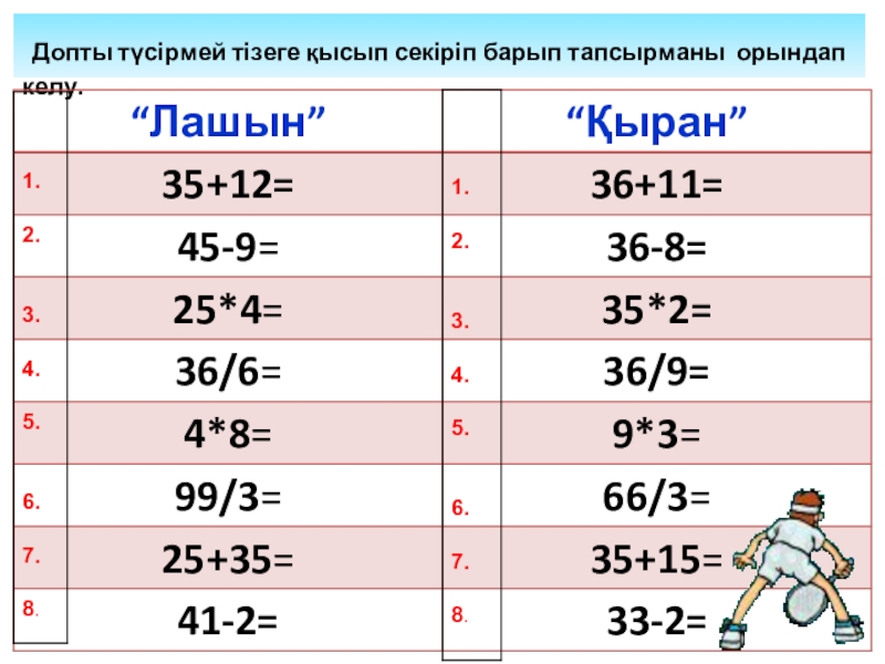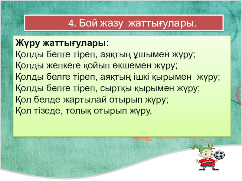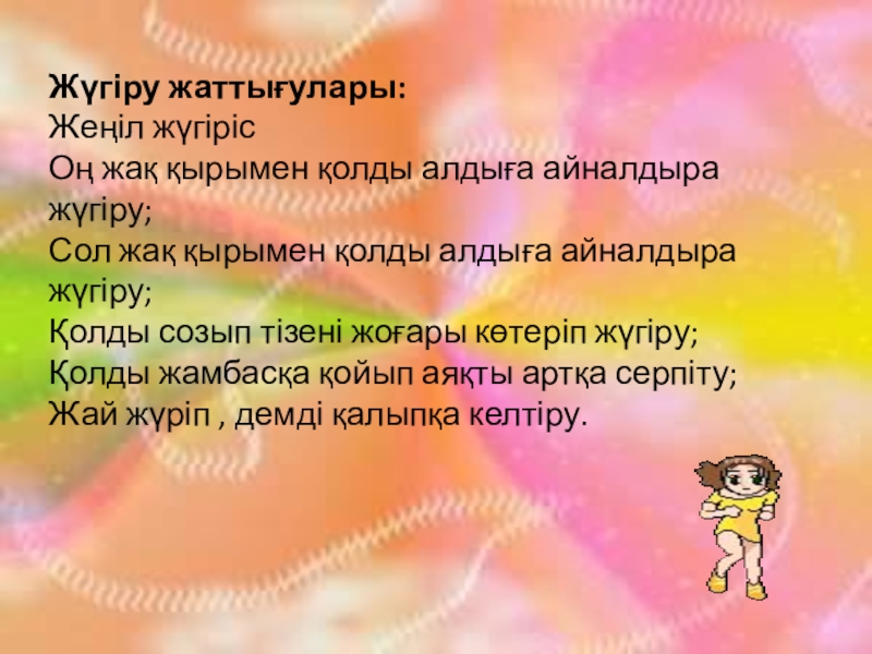 Алдыға иіліп, оң қолды сол аяқтың ұшына, сол қолды оң аяқтың ұшына алма кезек жеткізу.