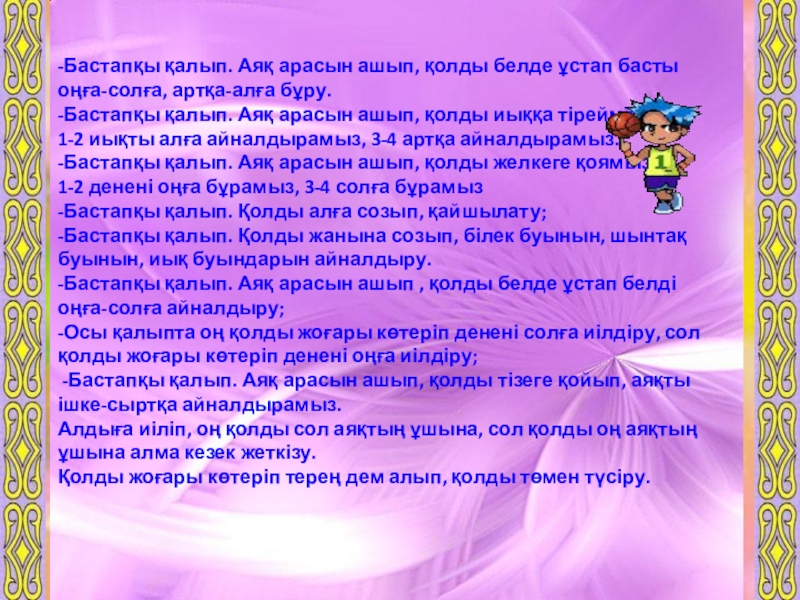 -Бастапқы қалып. Аяқ арасын ашып, қолды белде ұстап басты оңға-солға, артқа-алға бұру.