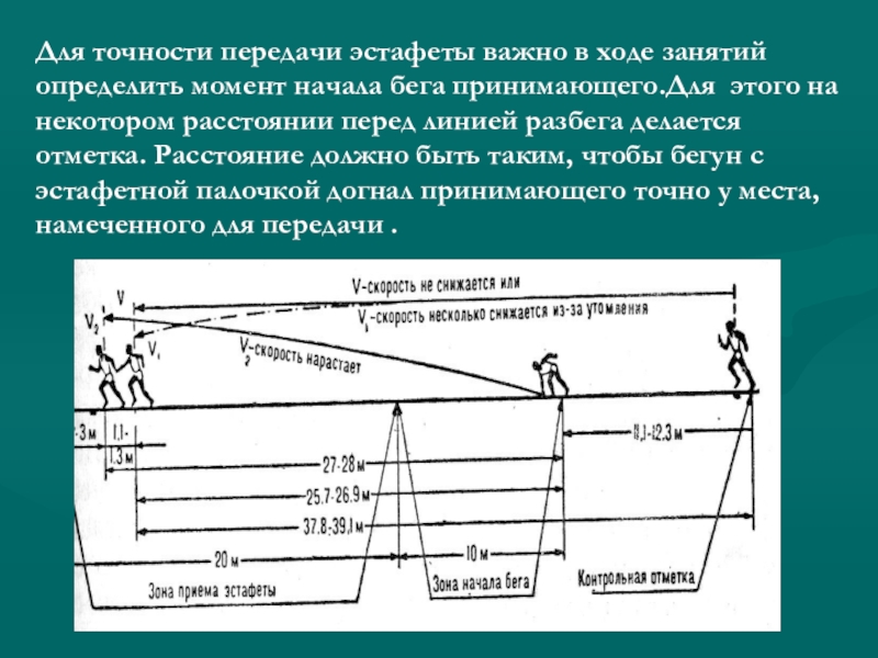 бега принимающего.Для этого на некотором расстоянии перед линией разбега делается отметка. Расстояние должно быть таким, чтобы бегун с эстафетной палочкой догнал принимающего точно у места, намеченного для передачи .