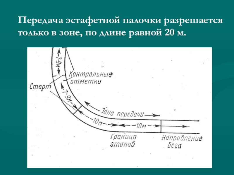 Слайд 9Передача эстафетной палочки разрешается только в зоне, по длине равной 20
