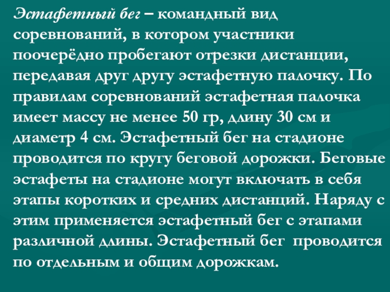 отрезки дистанции, передавая друг другу эстафетную палочку. По правилам соревнований эстафетная палочка имеет массу не менее 50 гр, длину 30 см и диаметр 4 см. Эстафетный бег на стадионе проводится по кругу беговой дорожки. Беговые эстафеты на стадионе могут включать в себя этапы коротких и средних дистанций. Наряду с этим применяется эстафетный бег с этапами различной длины. Эстафетный бег проводится по отдельным и общим дорожкам.