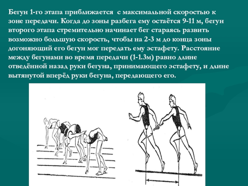 до зоны разбега ему остаётся 9-11 м, бегун второго этапа стремительно начинает бег стараясь развить возможно большую скорость, чтобы на 2-3 м до конца зоны догоняющий его бегун мог передать ему эстафету. Расстояние между бегунами во время передачи (1-1.3м) равно длине отведённой назад руки бегуна, принимающего эстафету, и длине вытянутой вперёд руки бегуна, передающего его.