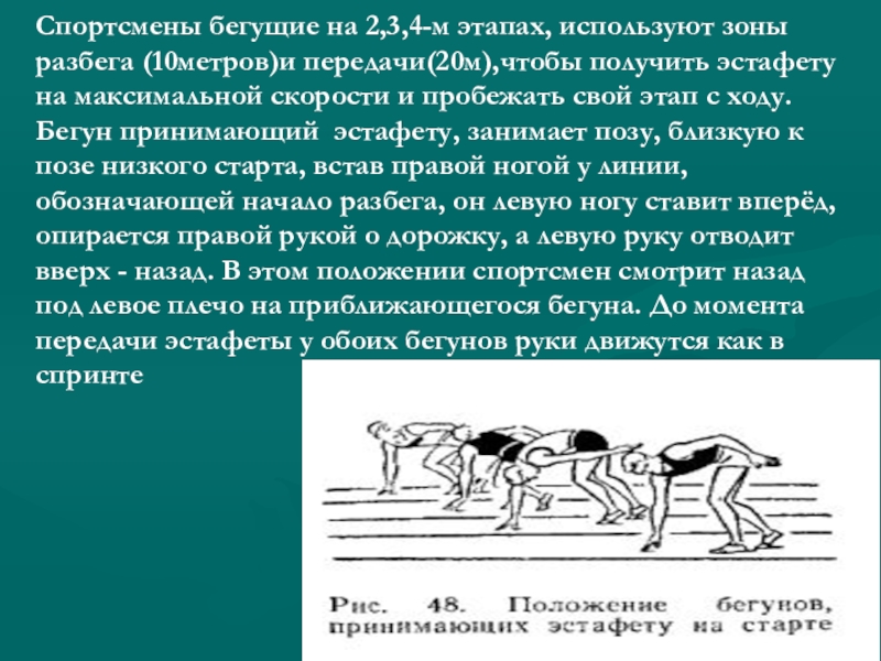 эстафету на максимальной скорости и пробежать свой этап с ходу. Бегун принимающий эстафету, занимает позу, близкую к позе низкого старта, встав правой ногой у линии, обозначающей начало разбега, он левую ногу ставит вперёд,