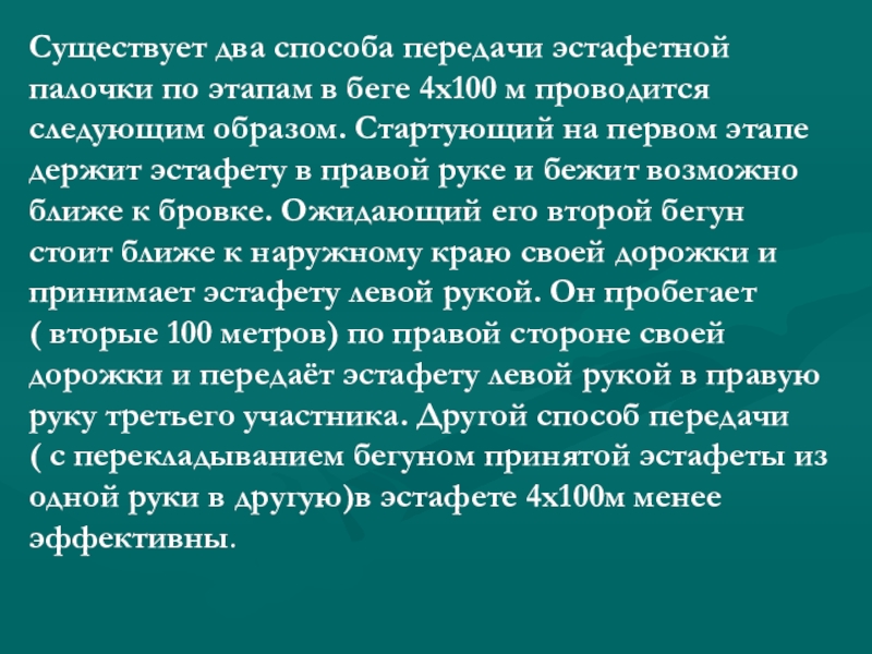 м проводится следующим образом. Стартующий на первом этапе держит эстафету в правой руке и бежит возможно ближе к бровке. Ожидающий его второй бегун стоит ближе к наружному краю своей дорожки и принимает эстафету левой рукой. Он пробегает ( вторые 100 метров) по правой стороне своей дорожки и передаёт эстафету левой рукой в правую руку третьего участника. Другой способ передачи ( с перекладыванием бегуном принятой эстафеты из одной руки в другую)в эстафете 4х100м менее эффективны.