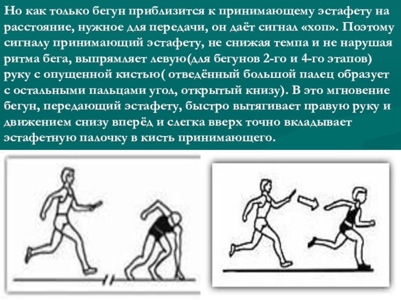 для передачи, он даёт сигнал «хоп». Поэтому сигналу принимающий эстафету, не снижая темпа и не нарушая ритма бега, выпрямляет левую(для бегунов 2-го и 4-го этапов) руку с опущенной кистью( отведённый большой палец образует с остальными пальцами угол, открытый книзу). В это мгновение бегун, передающий эстафету, быстро вытягивает правую руку и движением снизу вперёд и слегка вверх точно вкладывает эстафетную палочку в кисть принимающего.
