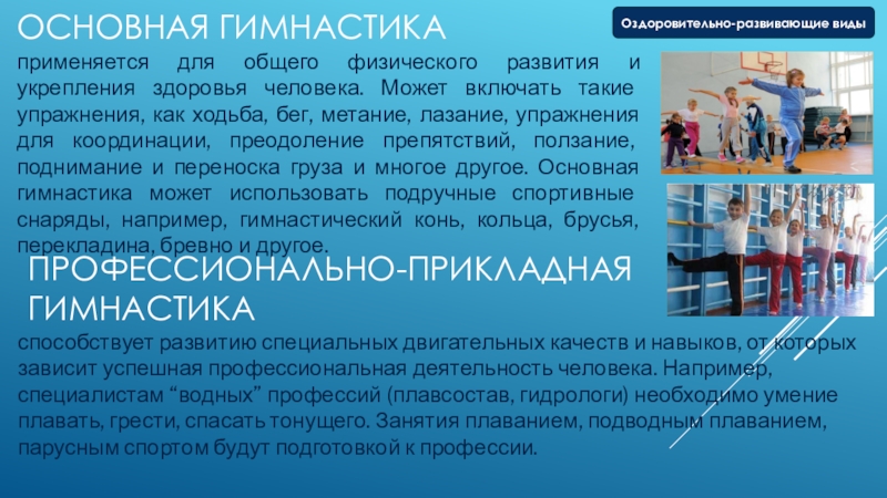 способствует развитию специальных двигательных качеств и навыков, от которых зависит успешная профессиональная деятельность человека. Например, специалистам “водных” профессий (плавсостав, гидрологи) необходимо умение плавать, грести, спасать тонущего. Занятия плаванием, подводным плаванием, парусным спортом будут подготовкой к профессии.