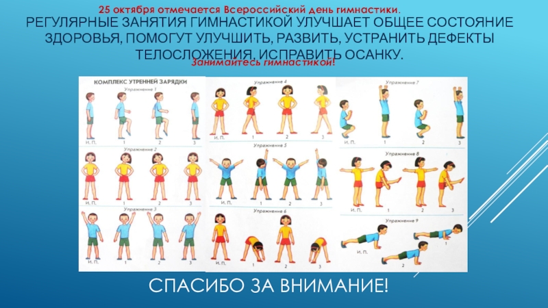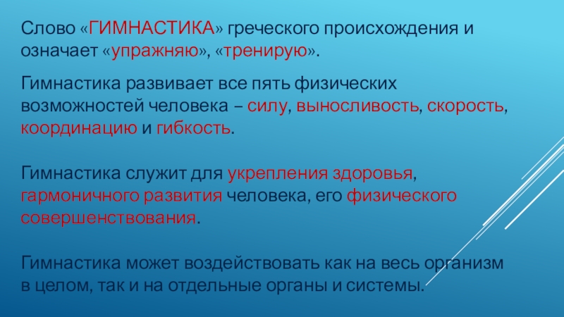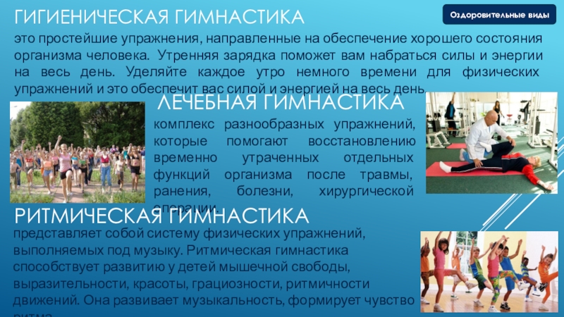 представляет собой систему физических упражнений, выполняемых под музыку. Ритмическая гимнастика способствует развитию у детей мышечной свободы, выразительности, красоты, грациозности, ритмичности движений. Она развивает музыкальность, формирует чувство ритма.
