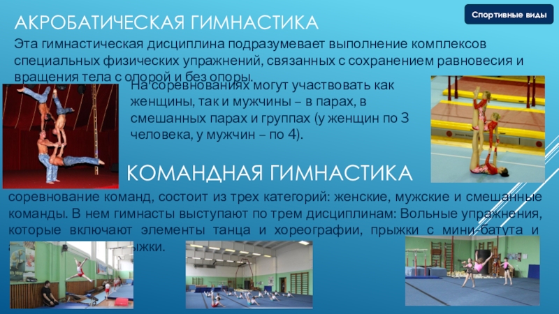 соревнование команд, состоит из трех категорий: женские, мужские и смешанные команды. В нем гимнасты выступают по трем дисциплинам: Вольные упражнения, которые включают элементы танца и хореографии, прыжки с мини-батута и акробатические прыжки.