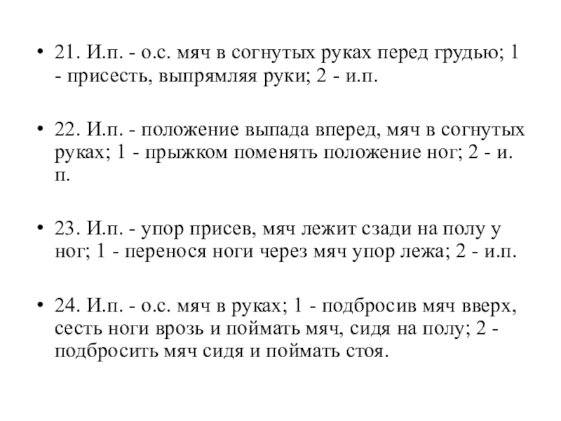 Слайд 921. И.п. - о.с. мяч в согнутых руках перед грудью; 1