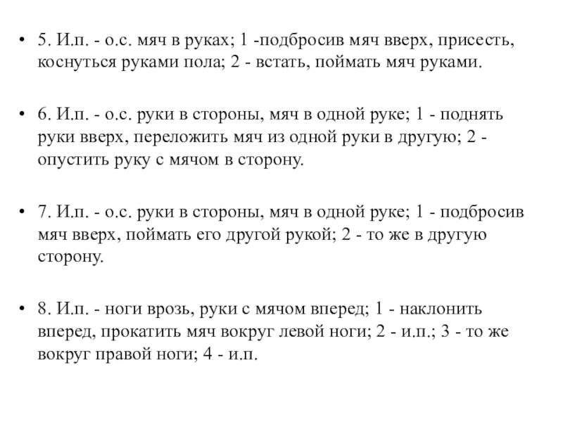 присесть, коснуться руками пола; 2 - встать, поймать мяч руками.
