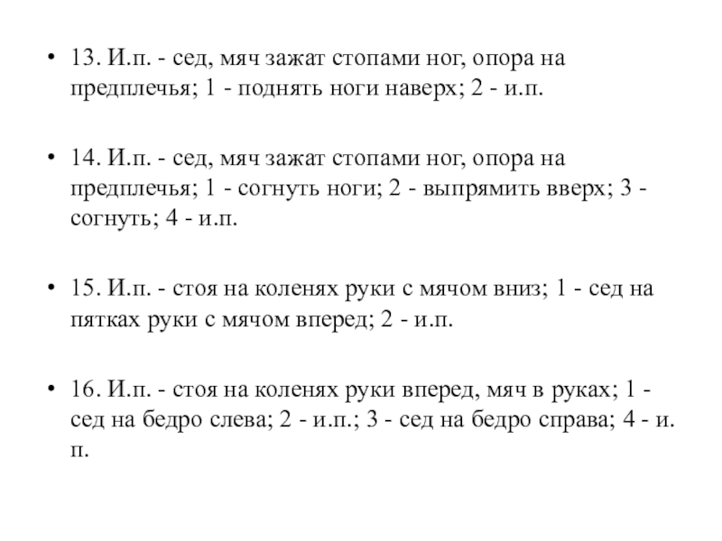Слайд 713. И.п. - сед, мяч зажат стопами ног, опора на предплечья;