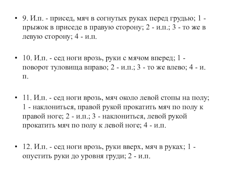 12. И.п. - сед ноги врозь, руки вверх, мяч в руках; 1 - опустить руки до уровня груди; 2 - и.п.