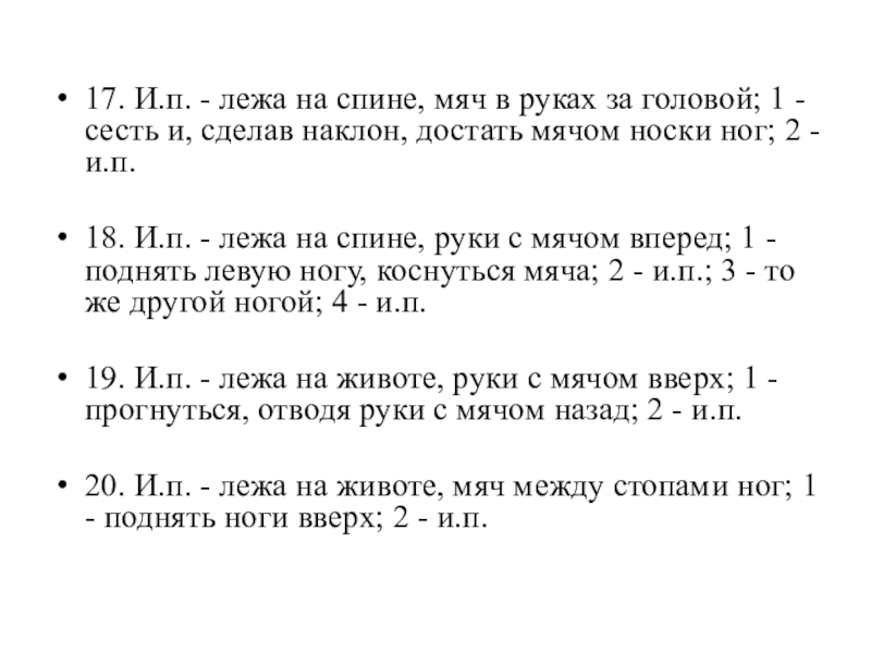 19. И.п. - лежа на животе, руки с мячом вверх; 1 - прогнуться, отводя руки с мячом назад; 2 - и.п.