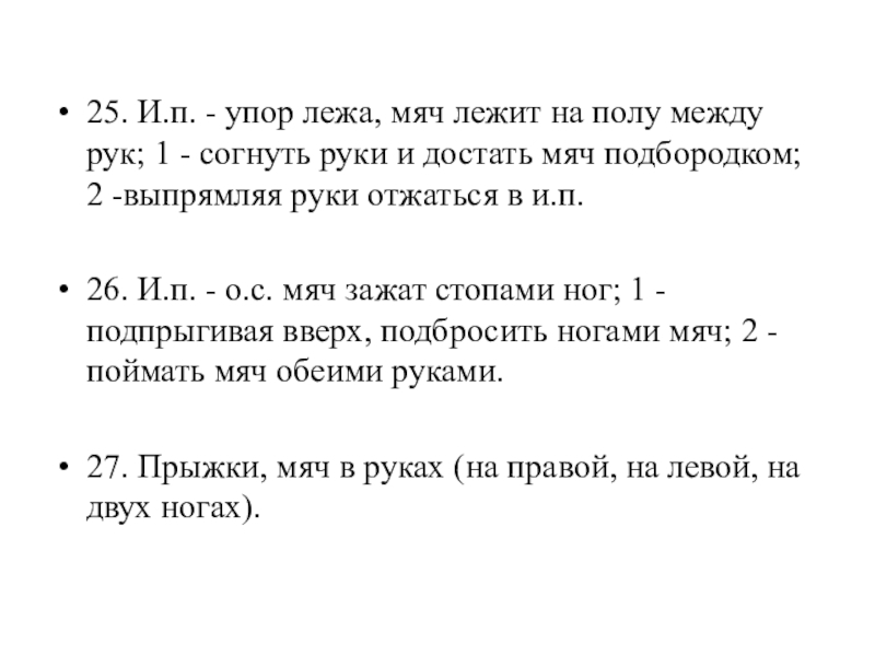 Слайд 1025. И.п. - упор лежа, мяч лежит на полу между рук;