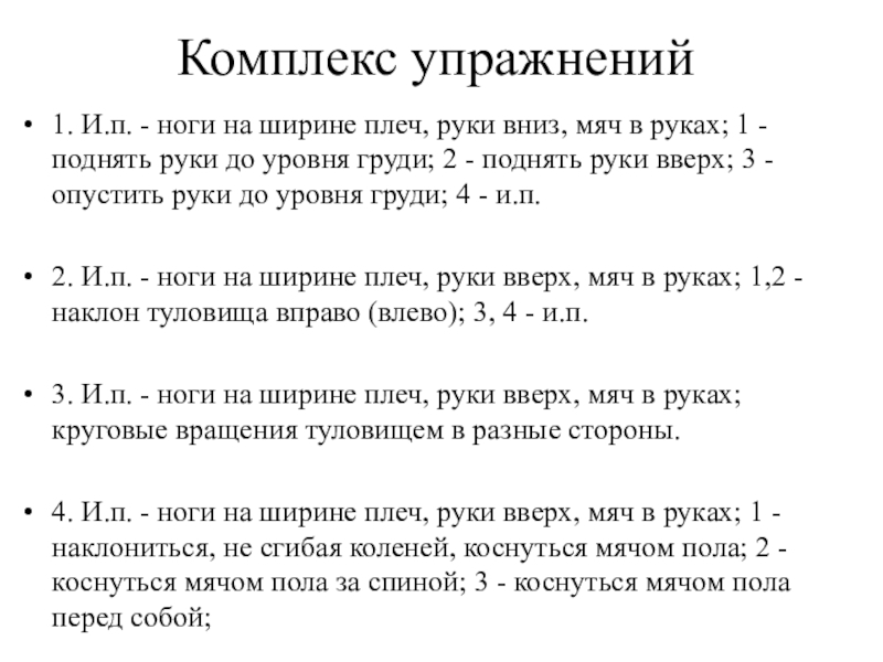 1. И.п. - ноги на ширине плеч, руки вниз, мяч