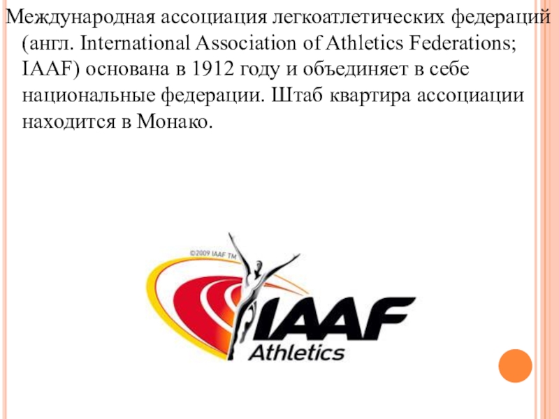 Athletics Federations; IAAF) основана в 1912 году и объединяет в себе национальные федерации. Штаб квартира ассоциации находится в Монако.