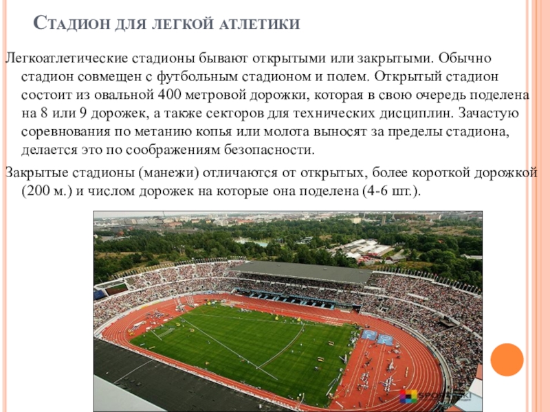 Легкоатлетические стадионы бывают открытыми или закрытыми. Обычно стадион