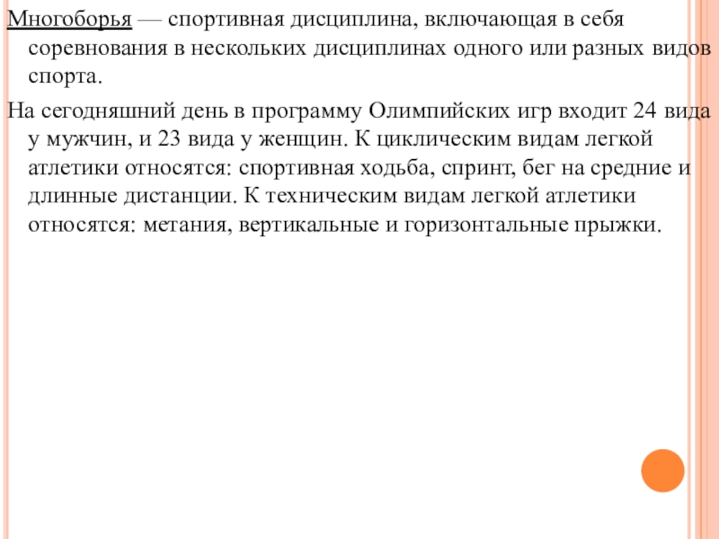в себя беговые виды, спортивную ходьбу, многоборья, пробеги, кроссы и технические виды. Легкую атлетику принято называть королевой спорта, потому что она является одним из самых массовых видов спорта и в её дисциплинах всегда разыгрывалось наибольшее количество медалей на Олимпийских играх.