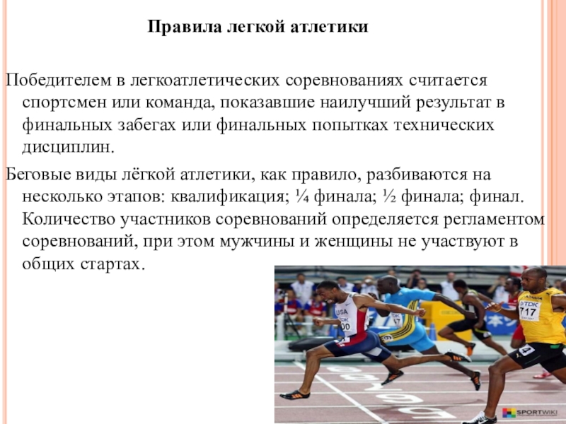 Беговые виды лёгкой атлетики, как правило, разбиваются на несколько этапов: квалификация; ¼ финала; ½ финала; финал. Количество участников соревнований определяется регламентом соревнований, при этом мужчины и женщины не участвуют в общих стартах.