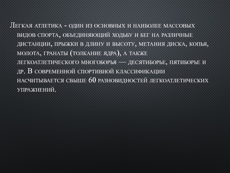 Слайд 2Легкая атлетика - один из основных и наиболее массовых видов спорта,