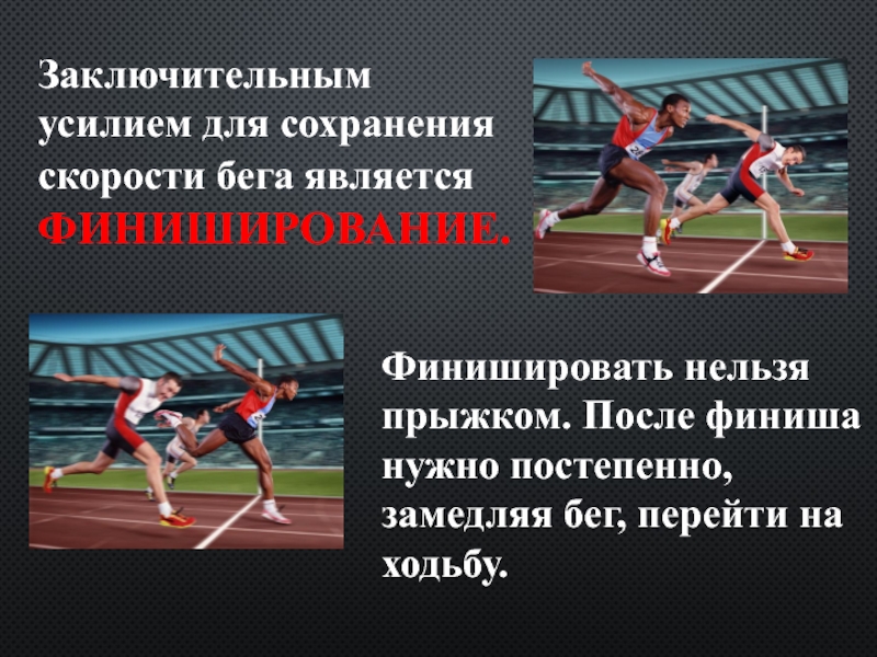 Слайд 17Заключительным усилием для сохранения скорости бега является ФИНИШИРОВАНИЕ.