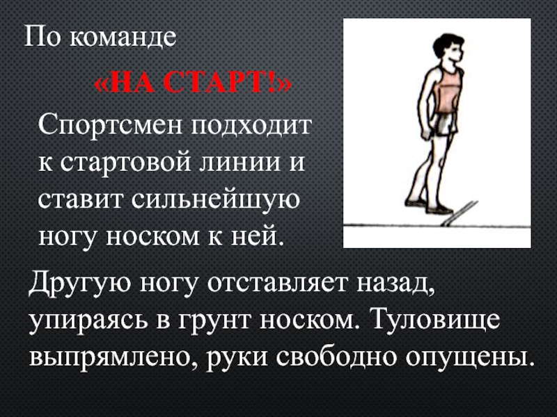Слайд 12Спортсмен подходит к стартовой линии и ставит сильнейшую ногу носком к