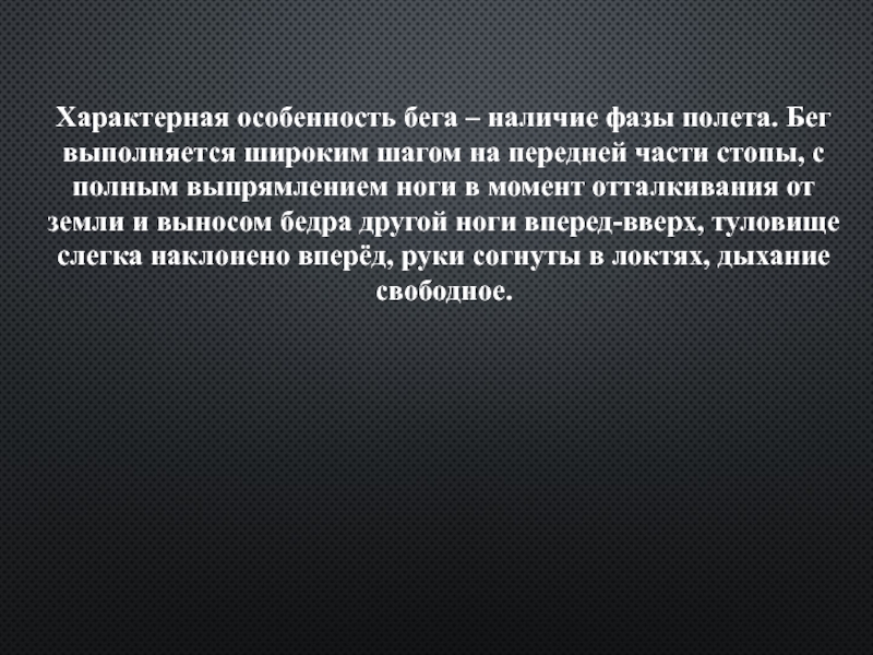 Слайд 9Характерная особенность бега – наличие фазы полета. Бег выполняется широким шагом