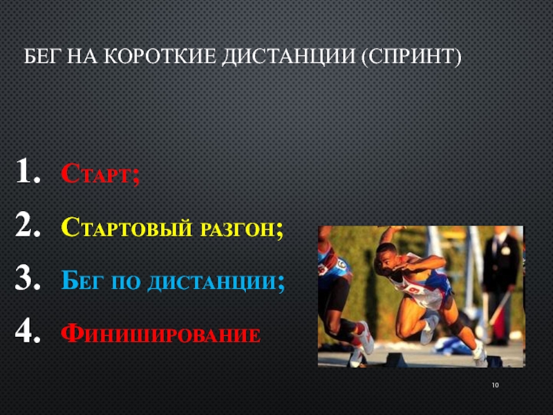 Слайд 10БЕГ НА КОРОТКИЕ ДИСТАНЦИИ (СПРИНТ)