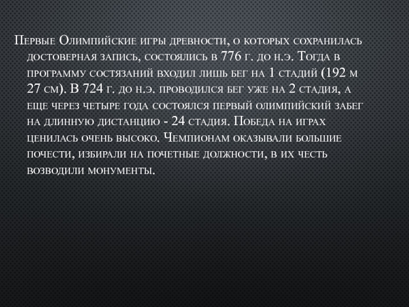 776 г. до н.э. Тогда в программу состязаний входил лишь бег на 1 стадий (192 м 27 см). В 724 г. до н.э. проводился бег уже на 2 стадия, а еще через четыре года состоялся первый олимпийский забег на длинную дистанцию - 24 стадия. Победа на играх ценилась очень высоко. Чемпионам оказывали большие почести, избирали на почетные должности, в их честь возводили монументы.