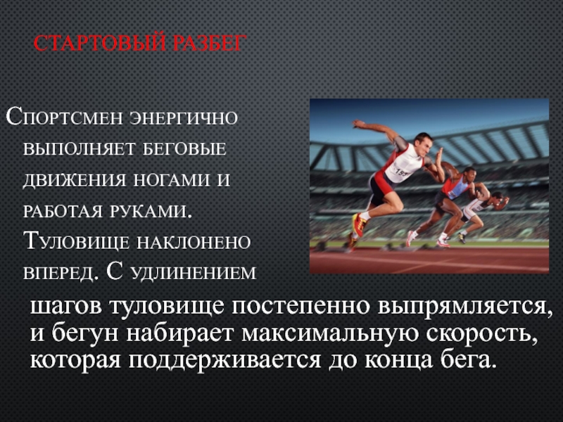 шагов туловище постепенно выпрямляется, и бегун набирает максимальную скорость, которая поддерживается до конца бега.