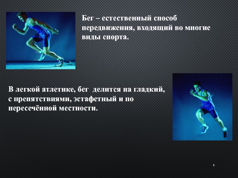 Слайд 8Бег – естественный способ передвижения, входящий во многие виды спорта.