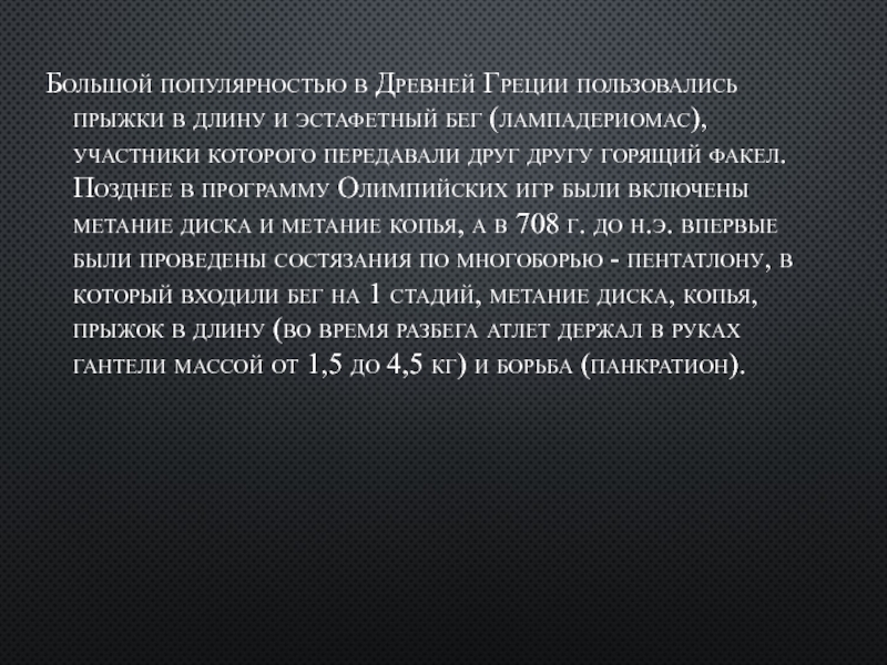 Слайд 5Большой популярностью в Древней Греции пользовались прыжки в длину и эстафетный