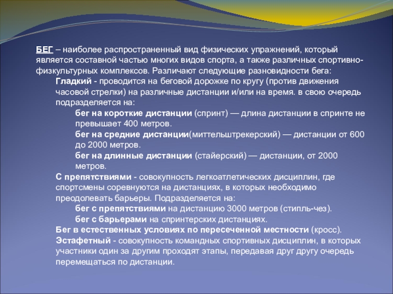 видов спорта, а также различных спортивно-физкультурных комплексов. Различают следующие разновидности бега: