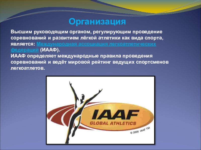 вида спорта, является: Международная ассоциация легкоатлетических федераций (ИААФ).