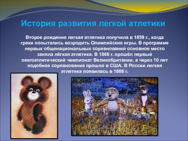 когда греки попытались возродить Олимпийские игры. В программе первых общенациональных соревнований основное место заняла лёгкая атлетика. В 1866 г. прошёл первый лекгоатлетический чемпионат Великобритании, а через 10 лет подобное соревнование прошло в США. В России легкая атлетика появилась в 1888 г.
