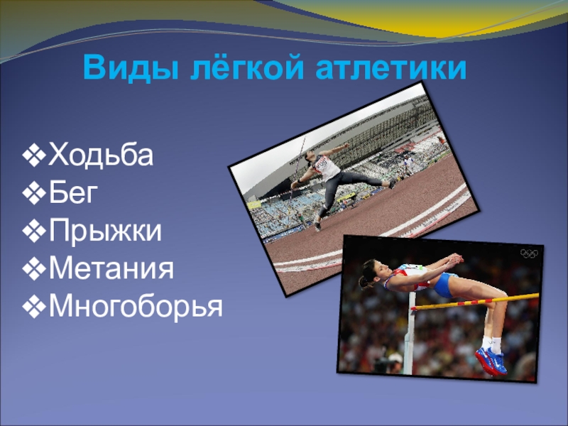 Слайд 2Лёгкая атле́тика — олимпийский вид спорта — олимпийский вид спорта, включающий бег, ходьбу, прыжки и