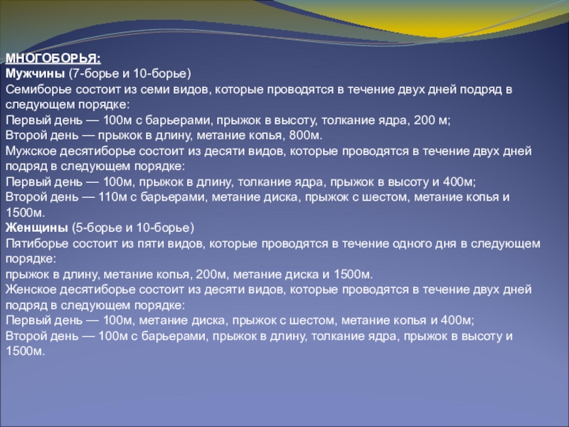 Женское десятиборье состоит из десяти видов, которые проводятся в течение двух дней подряд в следующем порядке: