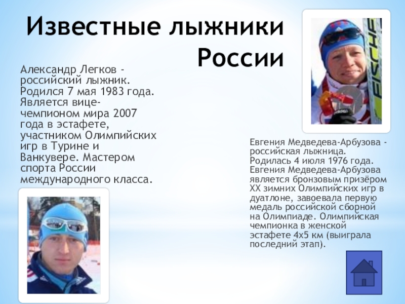 Евгения Медведева-Арбузова - российская лыжница. Родилась 4 июля 1976 года. Евгения Медведева-Арбузова является бронзовым призёром XX зимних Олимпийских игр в дуатлоне, завоевала первую медаль российской сборной на Олимпиаде. Олимпийская чемпионка в женской эстафете 4х5 км (выиграла последний этап).