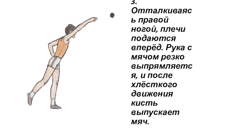 3. Отталкиваясь правой ногой, плечи подаются вперёд. Рука с мячом резко выпрямляется, и после хлёсткого движения кисть