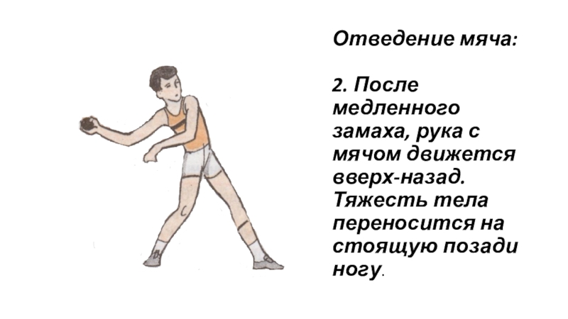Отведение мяча:  2. После медленного замаха, рука с мячом движется вверх-назад. Тяжесть тела переносится на стоящую