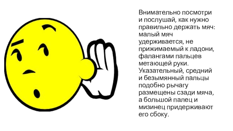 Слайд 3Внимательно посмотри и послушай, как нужно правильно держать мяч: малый мяч