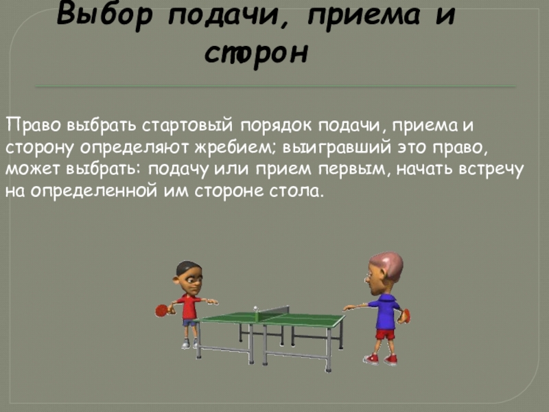 сторону определяют жребием; выигравший это право, может выбрать: подачу или прием первым, начать встречу на определенной им стороне стола.
