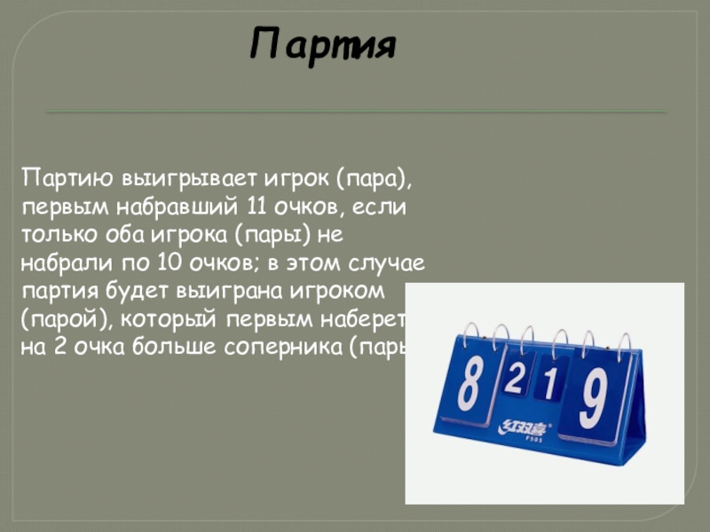 игрока (пары) не набрали по 10 очков; в этом случае партия будет выиграна игроком (парой), который первым наберет на 2 очка больше соперника (пары).