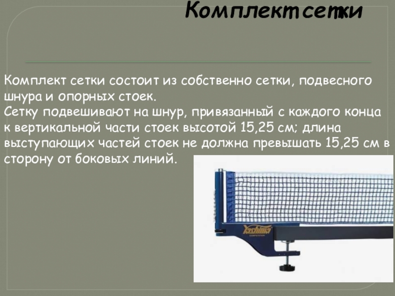 Сетку подвешивают на шнур, привязанный с каждого конца к вертикальной части стоек высотой 15,25 см; длина выступающих частей стоек не должна превышать 15,25 см в сторону от боковых линий.